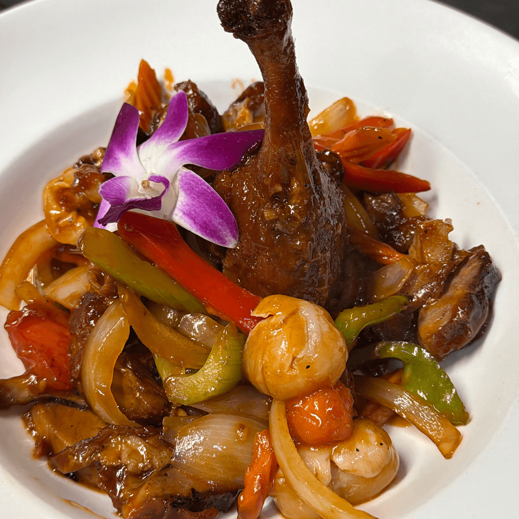 Half duck with spicy basil sauce, onion, bell pepper, basil leaves
