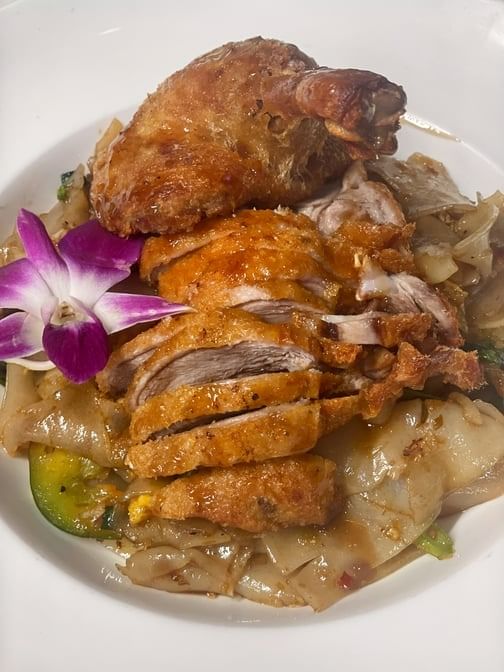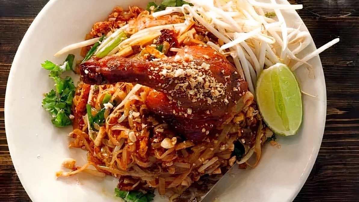 Crispy half duck with pad Thai noodle, bean sprouts, scallion peanut & egg
