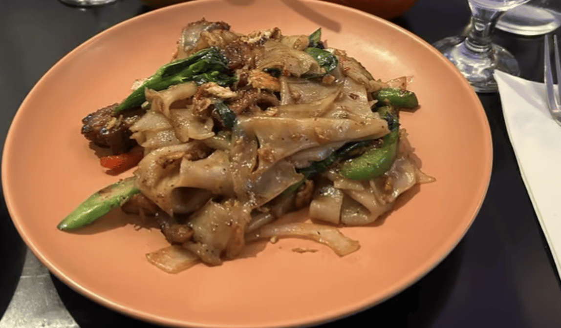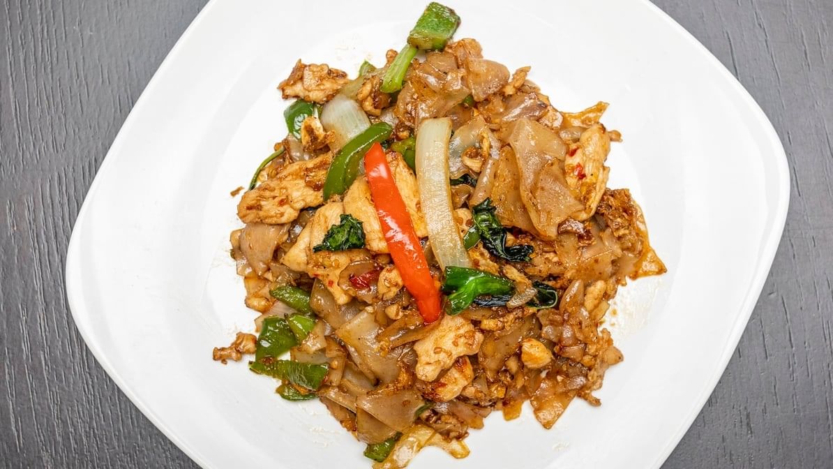 Spicy. Broad noodle, onion, Chinese broccoli, basil, bell pepper & egg