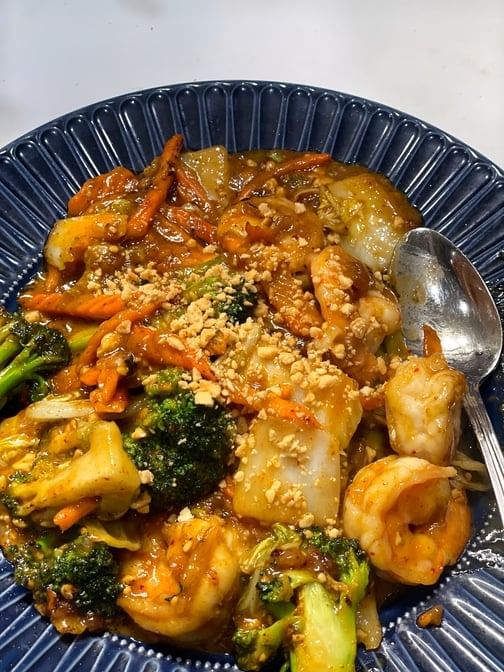 Spicy. Shrimp, calamari, mussel, fish and scallop, onion bell pepper in spicy chili jam sauce