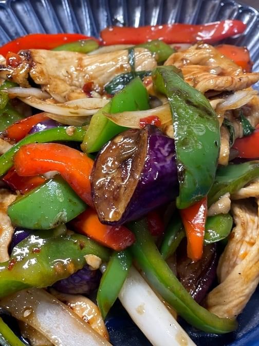Spicy. Onion, basil, bell pepper in spicy basil sauce