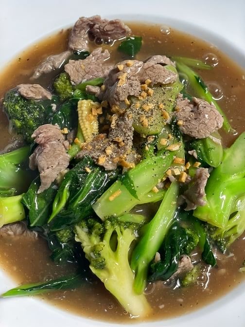 Broad noodle, broccoli, Chinese broccoli, baby corn in gravy black bean soup